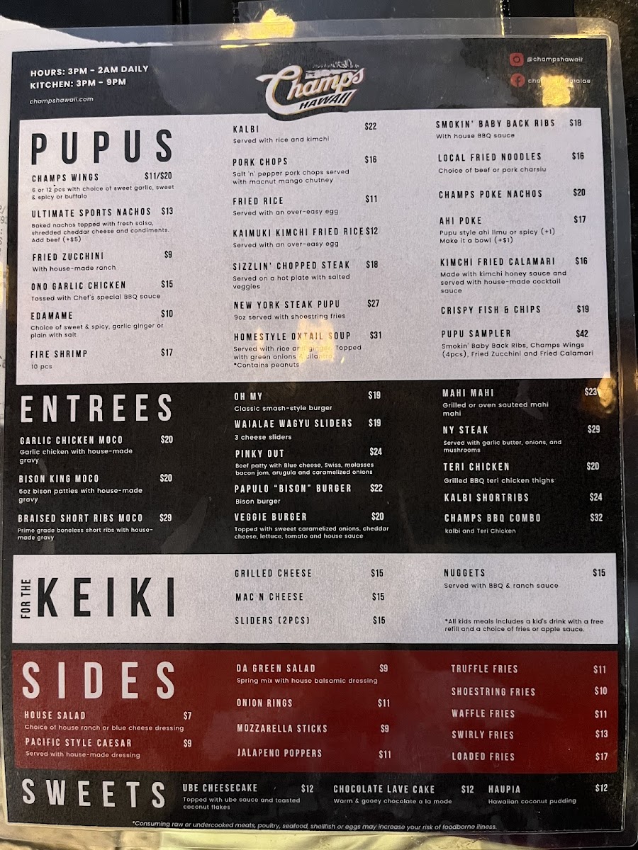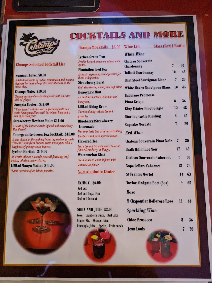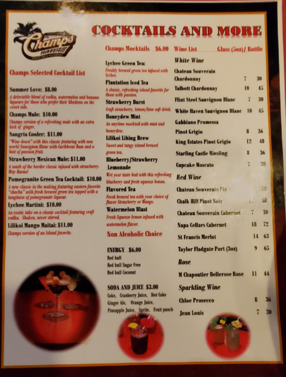 - Cocktails: Indulge in the Lilikoi Mango Maitai or the Champs Mule, offering a unique twist on classic favorites, all around $10-$12.
