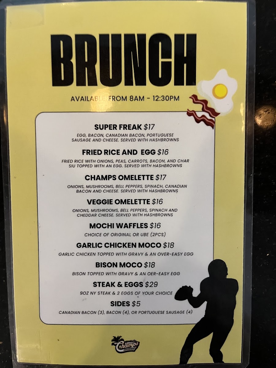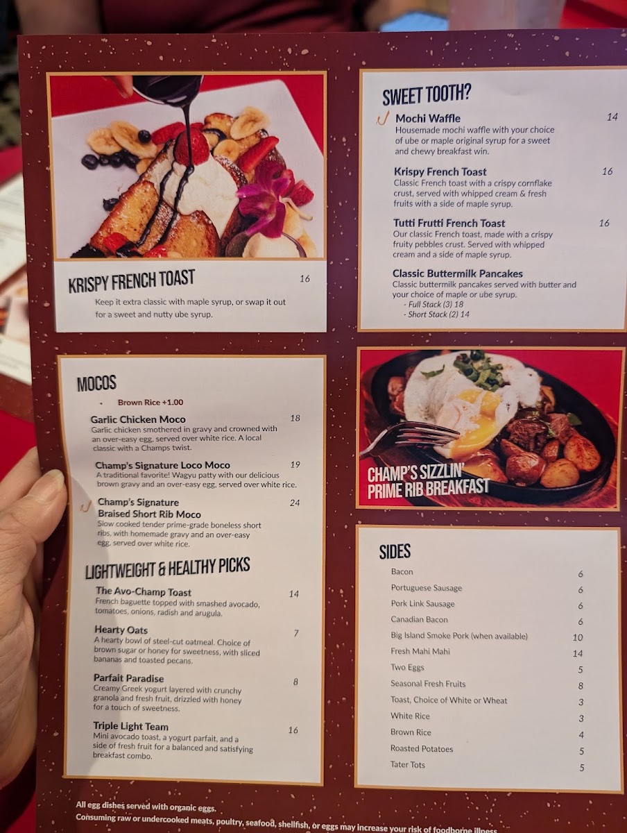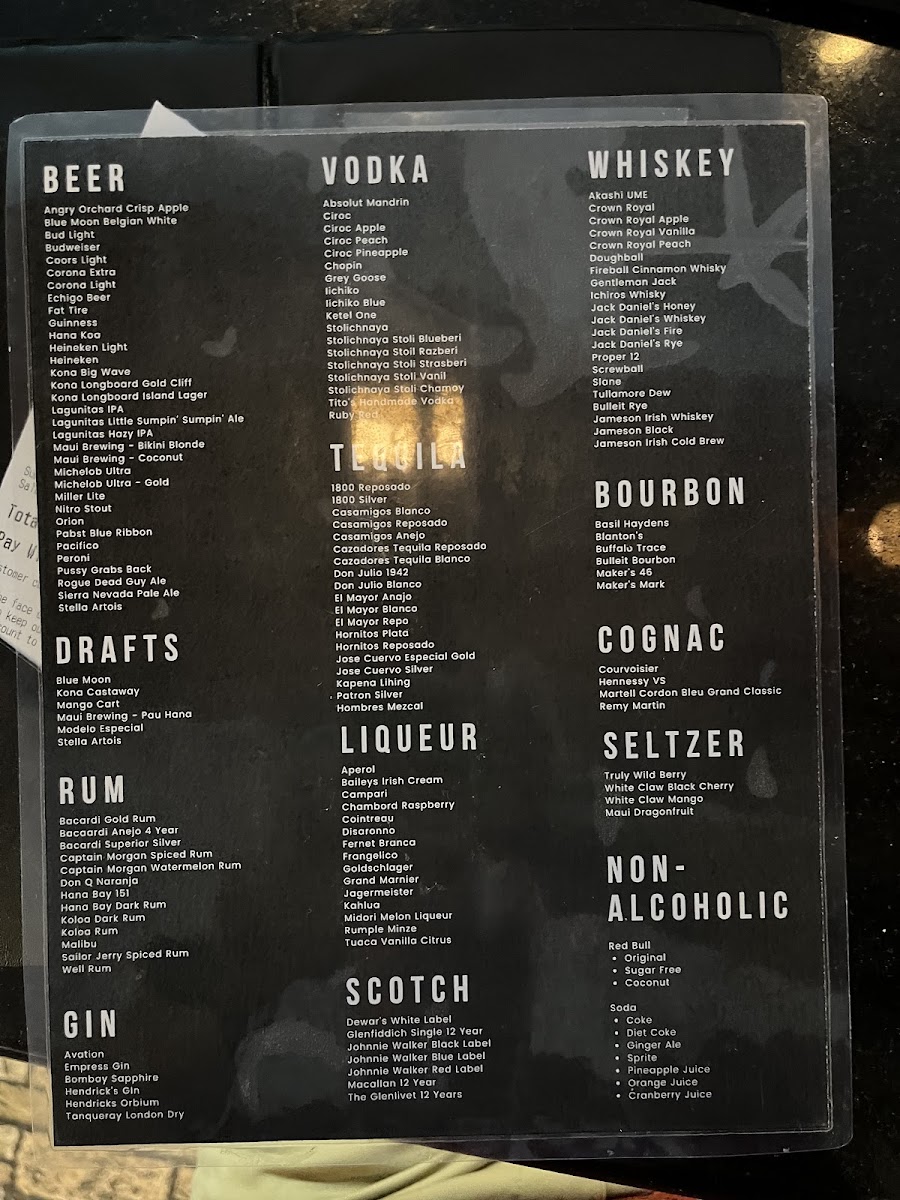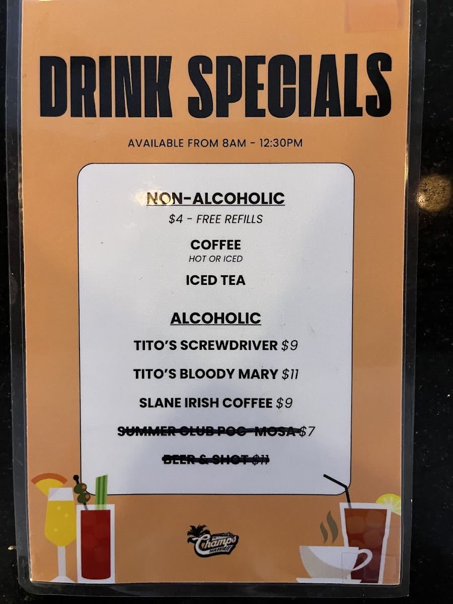- Cocktails: Indulge in the Lilikoi Mango Maitai or the Champs Mule, offering a unique twist on classic favorites, all around $10-$12.