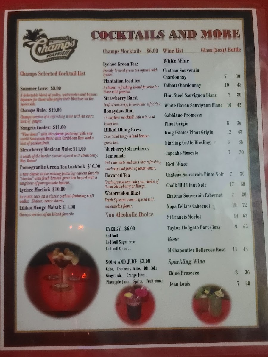 Welcome to Champs Hawaii, nestled at 3457 Waialae Ave in Honolulu, where the island vibe meets a vibrant bar scene. The menu boasts an enticing array of mocktails and cocktails, perfect for both laid-back afternoons and lively evenings.